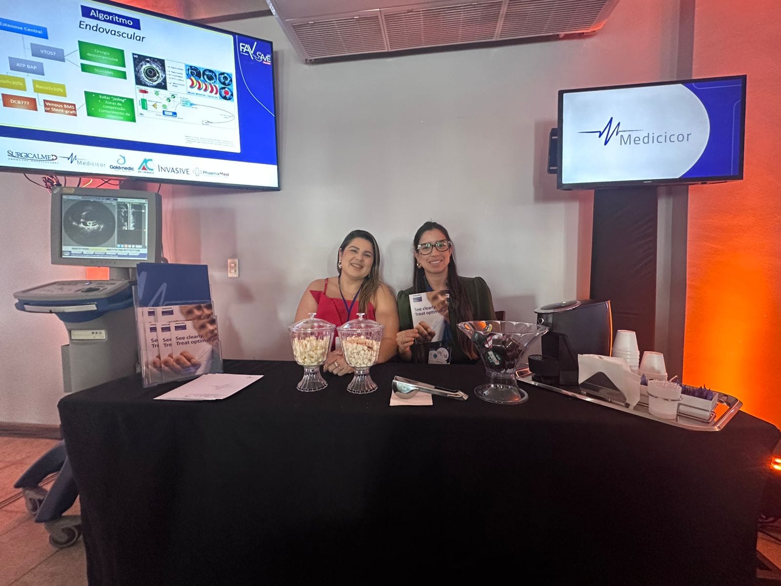 Um dos destaques do evento foi o stand da Medicicor, uma das empresas patrocinadoras do curso, que atraiu a atenção dos participantes interessados em conhecer o equipamento IVUS e suas funcionalidades.