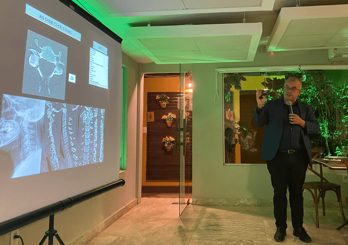 Em seguida o ortopedista Luís Carelli discorreu sobre a artroplastia cervical e sua evolução e citou as vantagens da utilização de alguns sistemas para a coluna, a exemplo da prótese Prestige LP cervical disc, do Cage Cervical com bloqueio e no caso da intervenção na cervical posterior, o sistema Vertex® Reconstruction.