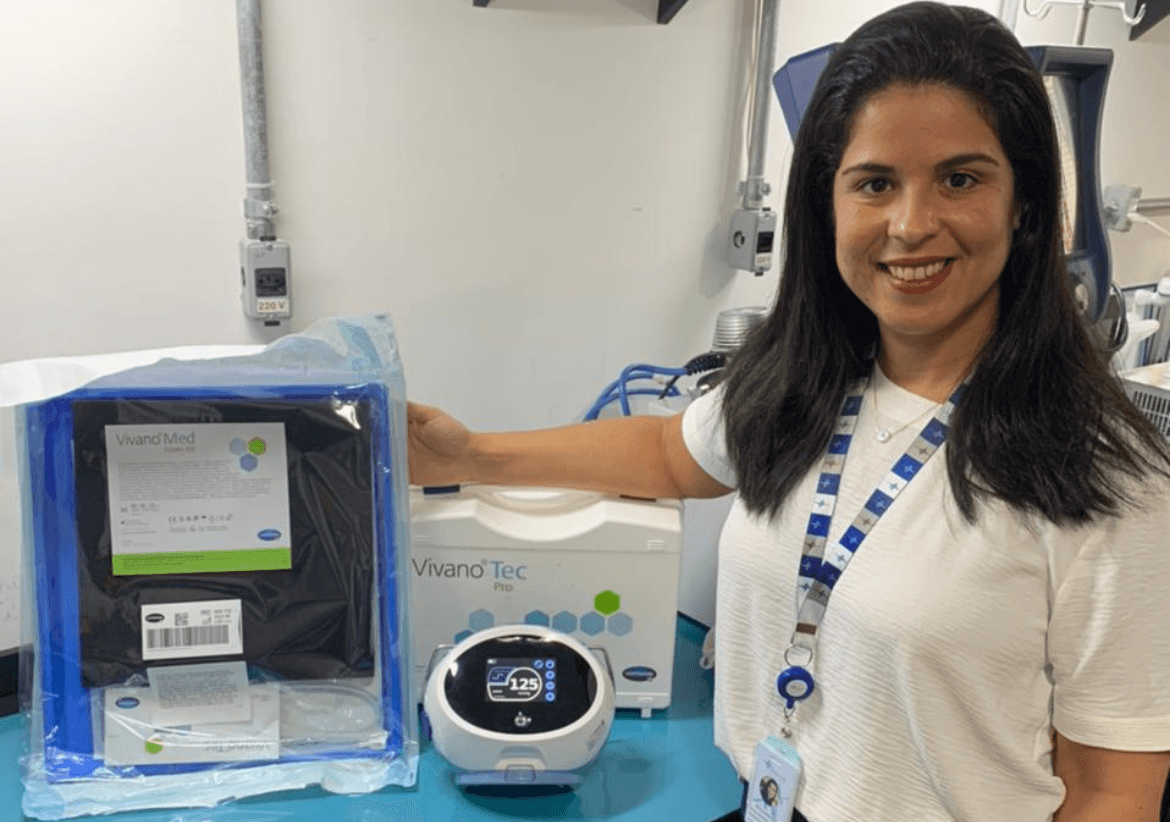 A atuação do cirurgião plástico Dr. Rafael Alves aliada à tecnologia inovadora oferecida pela VIVANO MED PRO – HARTMANN conseguiu a melhora completa da lesão. Segundo o relato do cirurgião, ”a paciente vinha de alguns desbridamentos e dias de curativos sem melhora. A terapia fez com que a ferida apresentasse rápida evolução, estando pronta para reconstrução cirúrgica após duas trocas, com posterior desospitalização. Ela estava extremamente deprimida e chorosa no internamento, então essa alta logo após nossa intervenção, deixou a paciente e equipe muito satisfeitas”, ressaltou.