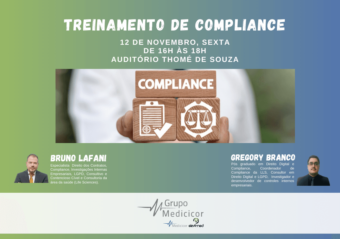 Um encontro para instruir sobre a interação entre as empresas do Grupo Medicicor e os profissionais da saúde, contemplando as regras gerais de relacionamento com terceiros, as especificidades, bem como as regras para participação em eventos, e outros assuntos. Este foi o principal objetivo do Treinamento de Compliance, realizado no dia 12 de novembro, no auditório do Edifício Empresarial Thomé de Souza, ministrado pelos advogados e consultores Bruno Lafani e Gregory Branco.